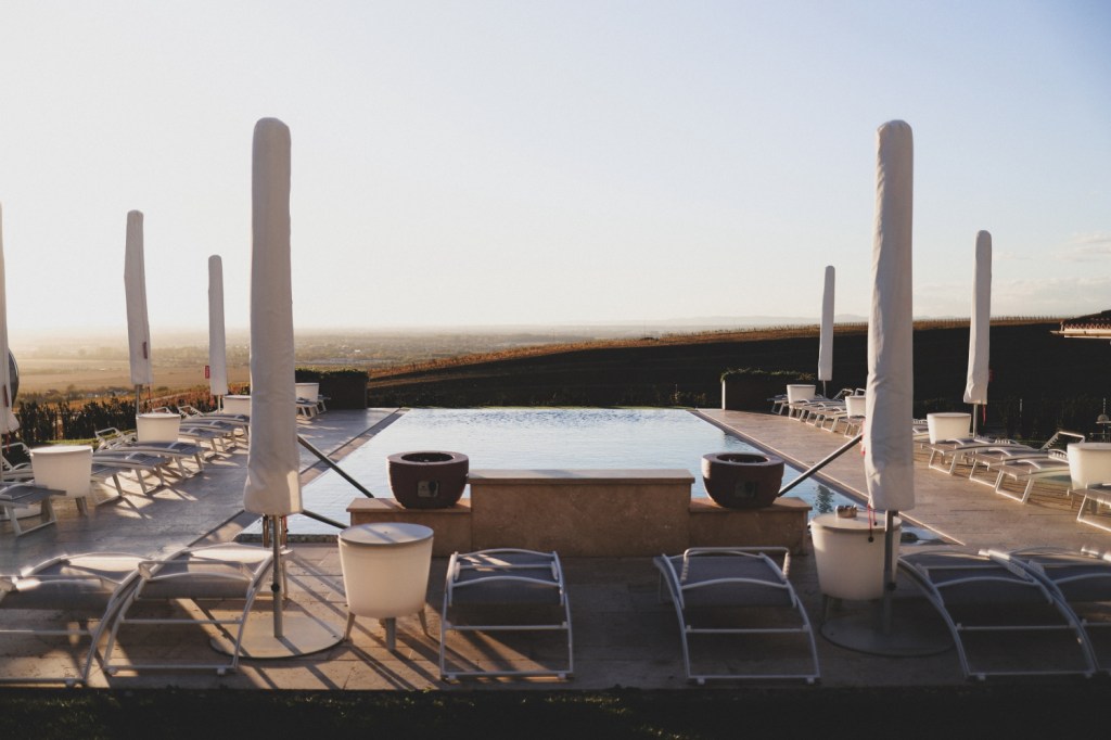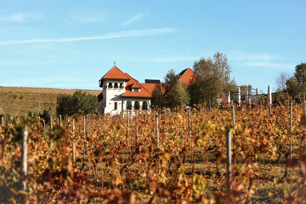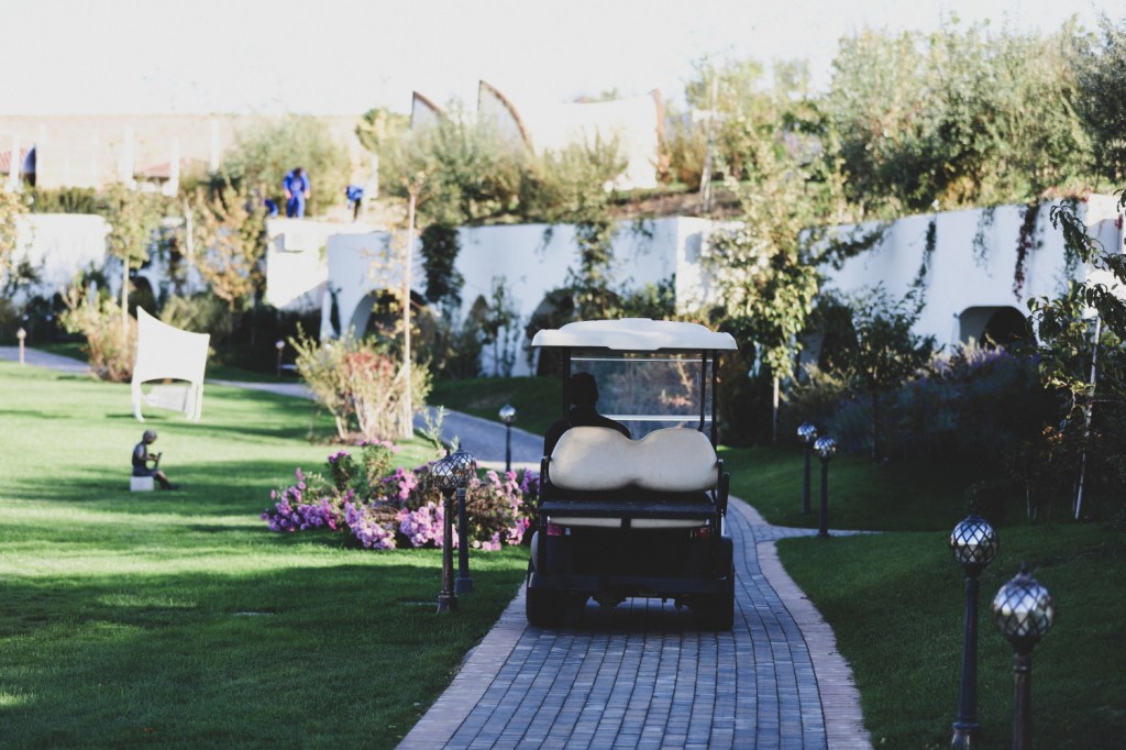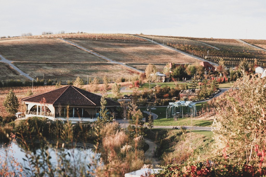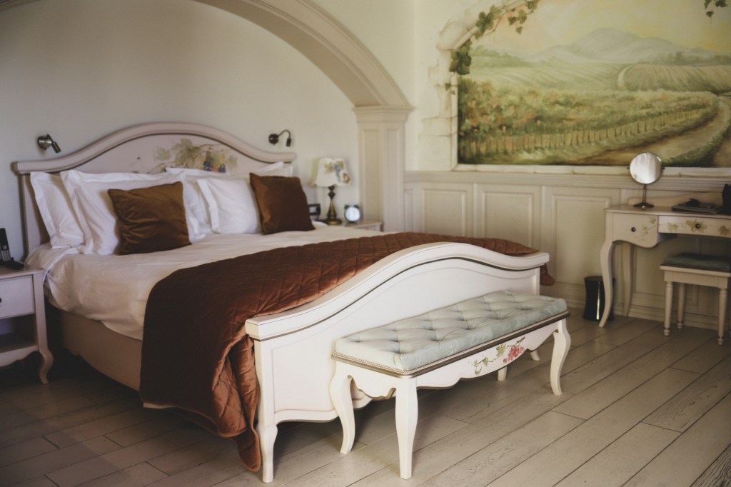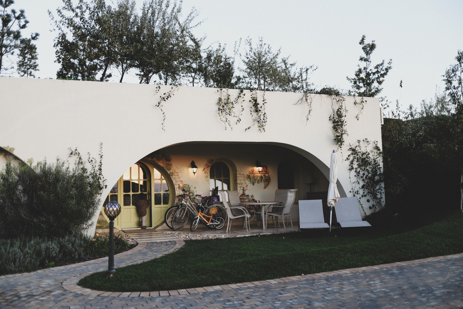 Cel mai probabil, bungalou-urile acestea cu usi rotunde si culori pastelate sunt cel mai emblematic punct al Casei Timis (asta desi “piesa” centrala a fost si zicem noi ca inca este, cladirea conacului). “Casute sub pamant” in mijlocul viilor (locatia se afla aproape de Drumul Vinului, pe un domeniu foarte mare, cu podgorii intregi de Sauvignon Blanc si Merlot), printre alei pavate, lacuri si multa verdeata. Fiecare bungalou poarta numele unor varietati de struguri (casuta noastra purta numele de Muscat Ottonel), internationale (Pinot Noir, Cabernet Franc, Sauvignon Blanc, Riesling, Shiraz, Chardonnay, Cabernet Saugvinon, Merlot, Aligote) dar si romanesti sau moldovenesti (Feteasca Alba, Feteasca Regala, Feteasca Neagra, Tamaioasa Romaneasca, Cramposie sau Francuta). Daaa, atat de multe sunt si din cate am inteles, exista planuri de extindere. Cele actuale sunt pe doua nivele iar noi am stat la cel de-al doilea nivel. Unde exista o zona de spatiu verde mai mare fata de cele de la primul etaj (este practic acoperisul caselor de la primul nivel, acoperit cu pamant si verdeata) si de unde se vede o priveliste superba peste colinele din jur. Si un apus minunat! Tot in zona aceasta de bungalouri se afla si piscina exterioara, si o zona de relaxare cu jacuzzi, si zona de spa. Fiecare bungalow are de fapt doua camere (cu exceptia suitelor) care pot fi interconectate, in cazul familiilor si sunt decorate intr-un mod foarte… gingas 🙂 Picturi pe pereti, picturi manuale pe diverse decoratiuni, culori pastelate si lemn sculptat. Ne scoate putin din rutina trendului actual, de design minimalist, scandinav, vazut la mai toate cazarile noi aparute in ultima vreme in Romania. Nu ca nu ne-ar placea designul scandinav (dimpotriva), insa decorurile de la Casa Timis sunt din alta poveste si ne-a prins tare bine schimbarea aceasta de stil. Chiar par ca scoase dintr-o poveste sau dintr-un decor de film. Sigur cei de pe platourile de filmare de la Hobbiton ar fi nespus de incantati de toate dragalaseniile si detaliile de aici 🙂