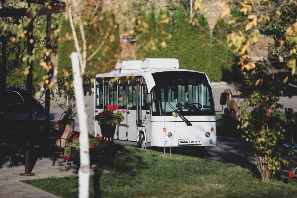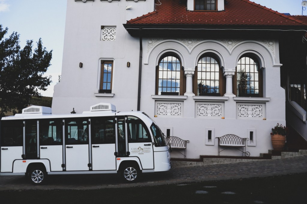 Intregul domeniu Casa Timis este urias. O suta patruzeci de hectare de podgorii, parcuri, lacuri si alei pavate care urca si coboara pe coline. Zona de bungalouri este un pic mai retrasa si mai indepartata de conacul principal. Se poate merge in plimbare pe jos sau cu bicicleta pana acolo (se pot inchiria biciclete de la locatie, noi le-am adus pe ale noastre) sau se poate lua mini-autobuzul electric care transporta oaspetii de la cladirea principala si restaurantul de langa conac pana la bungalouri. Noua ne placea sa ne plimbam, este extrem de frumos parcul si sunt multe zone de relaxare, alei, gradini si lacuri (si e o tare placut sa te plimbi printre ele, nu se simte distanta mare dintre bungalouri si conac, ba dimpotriva e chiar apreciata), insa au fost cateva situatii in care am fost nevoiti sa luam mini-autobuzul. Conacul insa ramane “vedeta” domeniului, fiind cel de la care a inceput tot ce este acum Casa Timis. Este construit in stil neoromanesc si a fost complet renovat si restaurat in 2018 (chiar atunci cand am mers noi pentru prima oara acolo). Si aici sunt camere si apartamente pentru cazare, decorate intr-un stil mai diferit fata de bungalouri. Conacul este superb iar la demisolul sau exista un bar englezesc care se numeste 1925, in cinstea anului in care a fost construit conacul. Este un bar pentru adulti (bineinteles :D), nu este o zona pentru copii, insa am mers sa il vedem/vizitam in timpul zilei. Serile, cand era destul de rece (si foarte intuneric) afara, stateam cu copiii in zona de relaxare din preajma receptiei, o zona cu canapele si mese unde puteam sa ne “intindem” cu toate activitatile pentru cei mici.