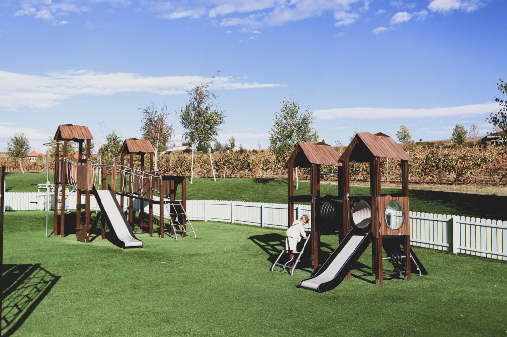 Sunt multe spatii de joaca in diferite locuri de pe domeniu, unul aproape de restarantul Veranda dintre vii, un altul la prima parcare de jos, unul in zona de lacuri si unul interior, in zona bungalourilor. Le stim pe toate ca-n palma, au fost atractiile principale ale acestor zile petrecute la Casa Timis. Oriunde mergeam, dadeam de cate un loc de joaca si nu era chip sa nu ne oprim un pic la joaca. Cel interior ne-a salvat, pentru ca era foarte aproape de bungaloul nostru si pentru ca am reusit sa ii tinem ocupati (si distrati) pe copii cata vreme am lucrat pe timpul zilei. Din fericire, fiind in timpul saptamanii, nu era deloc aglomerat, asa ca am fost mai mereu singuri acolo. Copiii se jucau iar noi lucram langa ei.