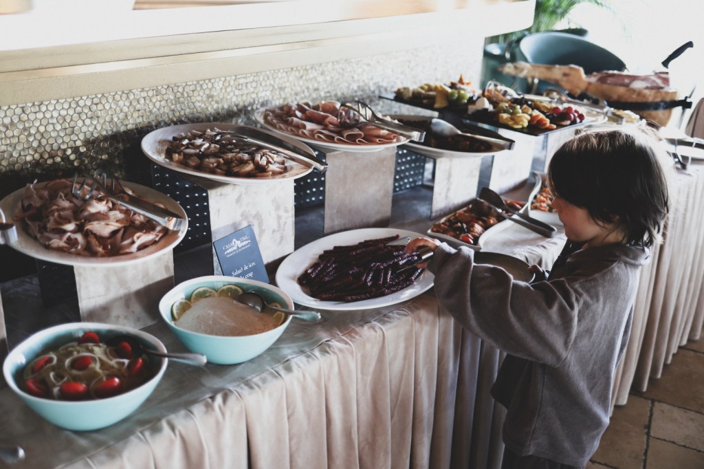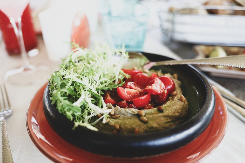 Sunt doua restaurante pe domeniul Casa Timis. Unul dintre ele este cel de langa conacul principal, Veranda dintre Vii, pe locul unde in 2018 se construia piscina. Se pare ca intre timp au transformat complet zona aceea si au construit restaurantul cu pereti de sticla si acoperis rabatabil, din interiorul caruia se poate vedea direct privelistea catre vie. Acesta are specific mediteranean iar mancarea este intr-adevar, extrem de buna, asa cum am tot auzit si citit prin recezii. Daca ar fi sa facem un top al preferatelor, eu una as incepe cu mixul de unturi colorate (Four Seasons Butter apare in meniu). Unturi cu aroma de trufe (cel bej), de Feteasca Neagra (cel mov), de salsa de leustean (cel verde) si de ardei iute (cel portocaliu). Care vin cu un cos de paine delicioasa, pita facuta cu zer in loc de apa si paine de smochine. Cu tot (non)-regretul aferent rasfatului acesta, am mancat in fiecare zi si aproape la fiecare masa aceste unturi. Si pare ca nu suntem singurii de aceasta parere, cele mai multe recenzii referitoare la acest restaurant mentioneaza fara gres unturile acestea. Apoi, humusul de vinete ni s-a mai parut delicios, trio-ul de mezze vegetarian de asemenea, iar copiilor pastele. Pe langa meniul principal au si trei variante de mancare pentru copii, paste cu sos rosu, paste carbonara si snitele. Fara doar si poate pastele au fost preferatele celor mici, iar cele cu sos rosu mi s-au parut chiar si mie unele dintre cele mai bune paste mancate vreodata. Supa rece de iaurt ni s-a parut tuturor delicioasa (ca o crema de iaurt, cu rodii si menta, demential de buna), la fel si fileul de somon cu legume juliene. Preferatele lui Andrei (carnivor convins) au fost pieptul de rata cu sos de portocale si cotletele de miel cu arome orientale. Cu siguranta si preparatele din peste (foarte multe) sunt delicioase, nu am apucat sa le incercam insa. Deserturile… ar trebui complet interzise 😀 Sunt grozav de bune, in special baklava cheesecake si tarta cu lime.
