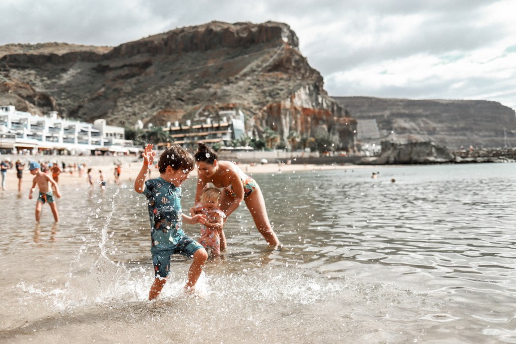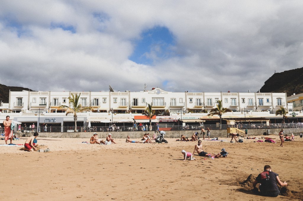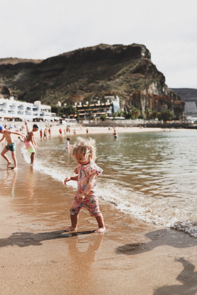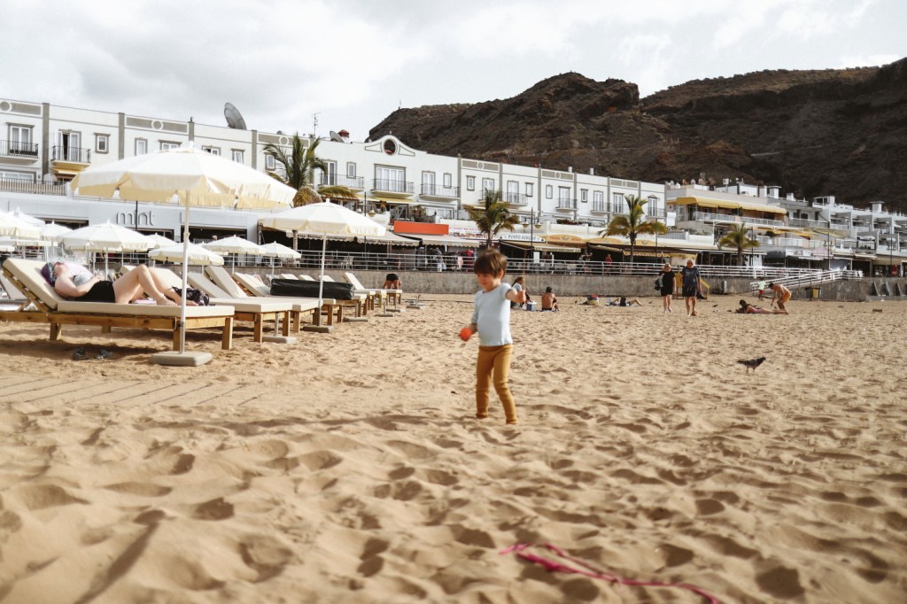 Weekend! Asadar zi de nelucrat pentru Andrei, zi completa de facut ceva dragut cu copiii π Ne-am gandit unde sa mergem, i-am intrebat si pe micuti si am hotarat impreuna sa mergem sa stam la plaja. Toata ziua. Cum la Playa de Mogan ne-am simtit cel mai bine de cand am venit (dar am mers imbracati extrem de nepotrivit, fara costume de baie si prosoape), am zis sa ne intoarcem acolo. Nu stiu daca este neaparat genul de plaja de inclus in Top 10 plaje din Gran Canaria (articolele de acest tip recomanda predominant Playa Anfi del Mar, Las Canteras, Maspalomas, Puerto Rico sau Amadores), insa noua ne-a placut mult aici. E foarte departe de a fi o plaja salbatica si linistita (chiar dimpotriva, e mereu aglomerata si agitata), dar spre deosebire de toate celelalte mentionate mai sus, e mult mai mica si mai intima. In orice caz, ne facusem temele si despre plaje mai putin populate, deci stiam de plaja Guigui, El Confital, MontaΓ±a de Arena sau Pasito Bea Beach (de fapt nu stiam neaparat, dar erau pe lista), insa nu am ajuns pe niciuna dintre acestea. Am preferat plaje mai potrivite pentru familii, ca sa ne fie mai usor cu cei mici. Daca prima oara cand am venit in Puerto de Mogan am prins o vreme calduroasa de parca erau zilele caniculare din Bucuresti in august (erau doar 21-22 grade maxim dar se simteau mult mai multe), in aceasta sambata am avut noroc de o vreme destul de capricioasa. E foarte interesant cum atunci cand era soare, cele 18-19 grade cate erau in acea zi se simteau ca peste 25, insa atunci cand cerul era acoperit de nori, era frig de-a binelea. Asa ca dupa cateva reprize de imbracat si dezbracat, am cam renuntat la planul de a ramane acolo intreaga zi. Am reconfigurat planul zilei astfel incat micutii sa doarma la pranz in masina, ne-am uitat pe Google Maps ce putem face in imprejurimi si am decis sa ne plimbam pe drumul de coasta GC-500, sa trecem prin fiecare statiune si sa vedem privelistea catre ocean. O parte din acest drum este inchisa traficului de ceva timp si e foarte probabil sa ramana inchisa de acum inainte (probabil vor construi un tunel in munte pentru a completa portiunea lipsa dintre Playa deMogan si Taurito). In aceasta zona drumul este distrus (cel putin asa am citit) si nu se intrevede o redeschidere sau reparare a drumului in viitorul apropiat. Dar am ocolit portiunea inchisa si am revenit pe GC-500 astfel incat sa parcurgem mare parte din acest drum de coasta si sa trecem prin statiunile si plajele Playa del Cura, Playa Amadores, Puerto Rico, Playa Anfi del Mar, Patalavaca si Arguineguin. Privelistile erau foarte frumoase, ce mi-a displacut insa in zona aceasta e faptul ca este extrem de transformata si populata. Sunt foarte multe constructii, foarte multe hoteluri, munti daramati sau βdecupatiβ pentru a face loc resorturilor, sate pline, dar absolut pline de case una lipita de alta si foarte multe santiere in lucru abandonate (hoteluri incepute si nefinalizate).