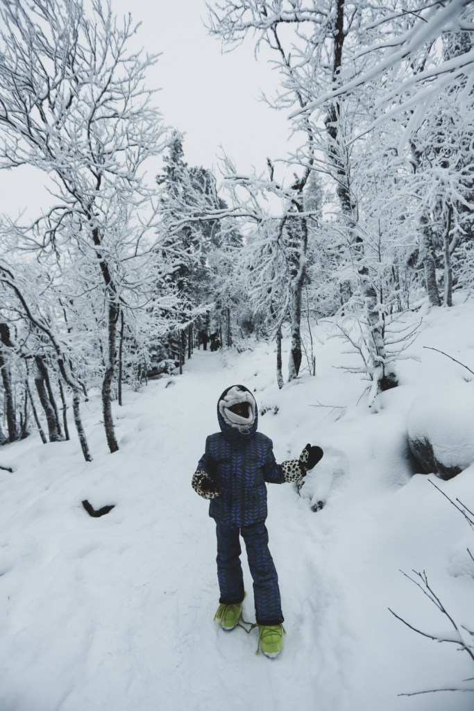 Caciula. Aici nu am mai luat nimic nou, am folosit ce aveam. Copiilor le-am luat cagule subtiri, de pus pe sub casca la schi (cele de la Joha, din lana merinos), iar pe deasupra am avut cu noi doua tipuri de cagule: cagule de lana fiarta captusite cu velur (cele de la Huttelihut) si cagule din fleece normal dar care aveau integrat si fular peste gura si nas (cele de la nanou). Noi, adultii, am folosit ce aveam deja (caciuli normale iar eu cagula pufoasa, mai mult fashionable decat practica, dar fiind foarte pufoasa mi-a tinut bine de cald). Ne-am descurcat super asa, dar pe parcursul zilelor am realizat ca ne-ar fi fost de folos variante de caciuli impermeabile. Cu ceva fas pe deasupra. Au fost multe zile in care a nins si chiar daca pe moment nu mi-am dat seama deloc ca ar putea sa fe o problema, dupa o ora de stat in ninsoare (sau ma rog, chiar mai putin de o ora) se depunea foarte multa zapada pe caciuli. Care se topea si uda caciulile. Nu era asa o mare problema, aveam cu totii glugi impermeabile pe care le-am si folosit, dar tot ansamblul de cagula subtire + cagula calduroasa si mega pufoasa + gluga i-a cam enervat pe copii. Daca vom mai merge, voi cauta cagule impermeabile, imblanite pe dedesubt, ca sa rezolvam problema asta :)))