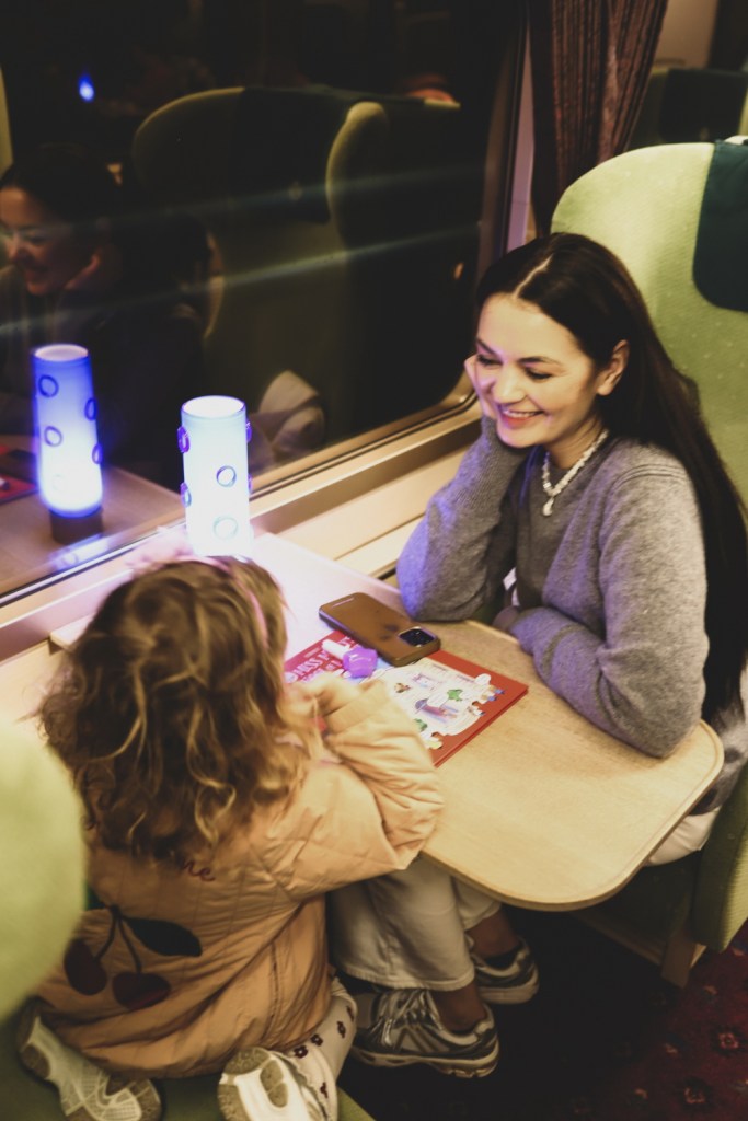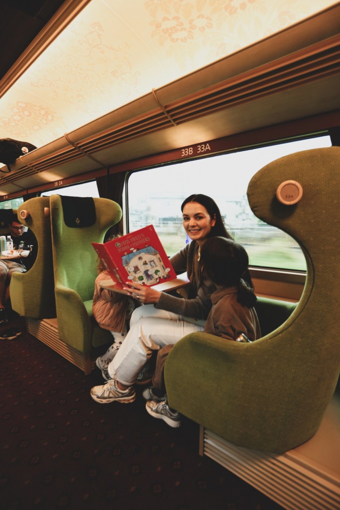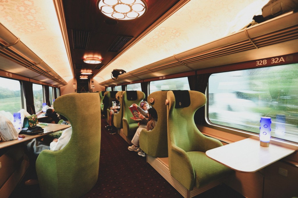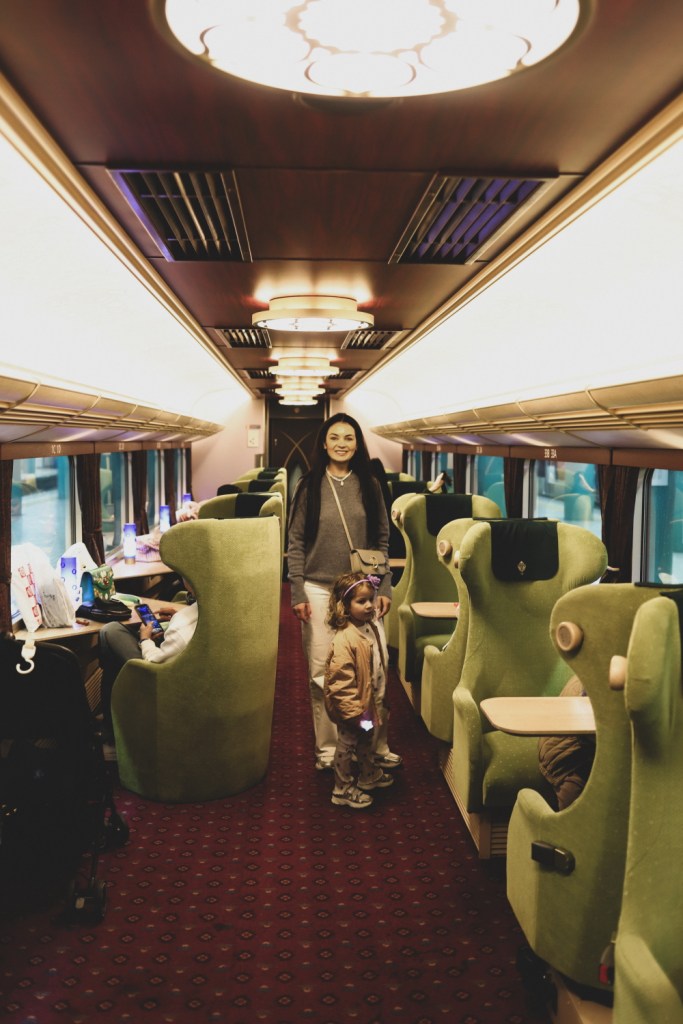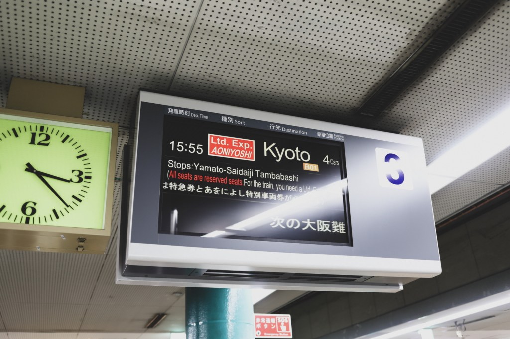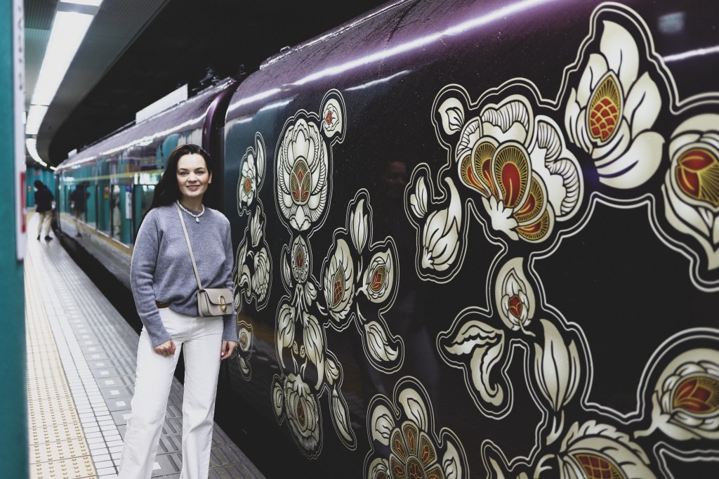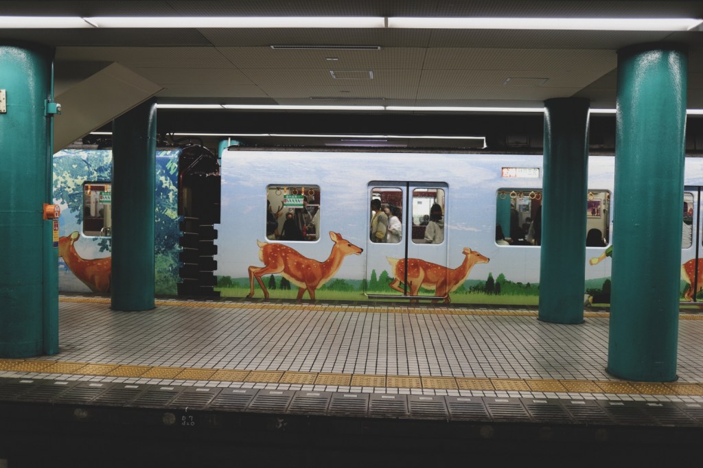Insa finalul zilei a fost de fapt atractia principala pentru noi 🙂 Si anume calatoria din Nara in Kyoto, cu trenul tematic Aoniyoshi. Este un tren special, care arata diferit fata de trenurile clasice (exteriorul si interiorul), care ne-a testat putin rabdarea, in sensul ca am cautat in disperare bilete pentru a putea merge cu el. Fiind perioada aceasta aglomerata, chiar si rezervand cu aproape o luna inainte biletele, abia am gasit locuri! Costa putin mai mult fata de trenurile normale, 13 euro pentru adulti si 7 pentru copii, insa a fost minunat! Ne-a placut foarte mult! Sunt doar cateva locuri intr-un vagon, in niste fotolii mari, verzi, generoase, orientate catre geamurile mari, prin care se vede privelistea pe tot drumul. Ne-a placut tare mult aceasta calatorie, chiar daca a durat foarte putin 🙂