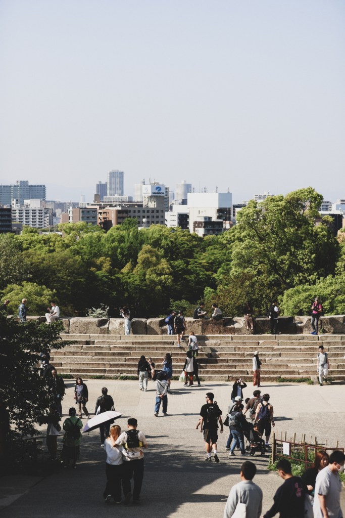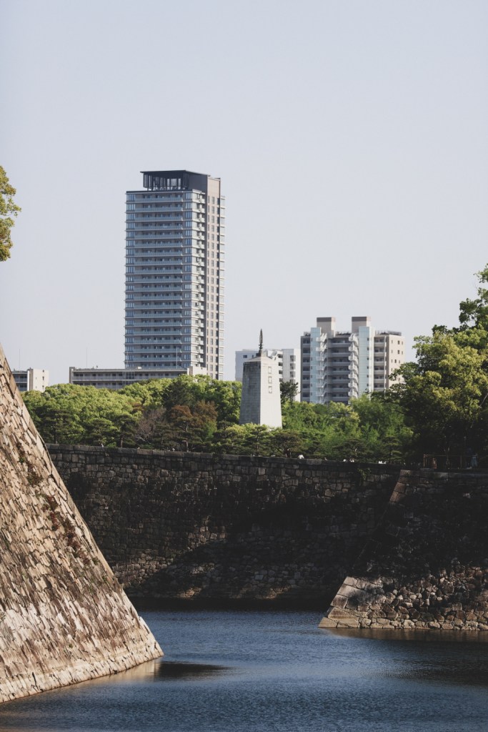 Pentru aceasta prima jumatate de zi in Osaka voiam sa facem ceva mai linistit, o plimbare lunga si linistita prin preajma castelului, ca sa ne revenim usor. Castelul este foarte frumos si a avut o istorie foarte tumultoasa. Daramat, atacat, lovit de fulger, ars si apoi reconstruit. Parcul din jurul castelului este foarte frumos, ne-am bucurat pe deplin de el. Chiar si asa, fara ciresii infloriti si fara hanami (picnicurile faimoase din perioada de sakura, sarbatoarea infloririi ciresilor).