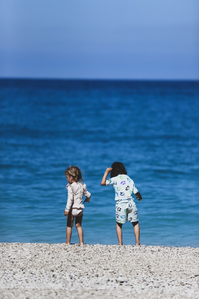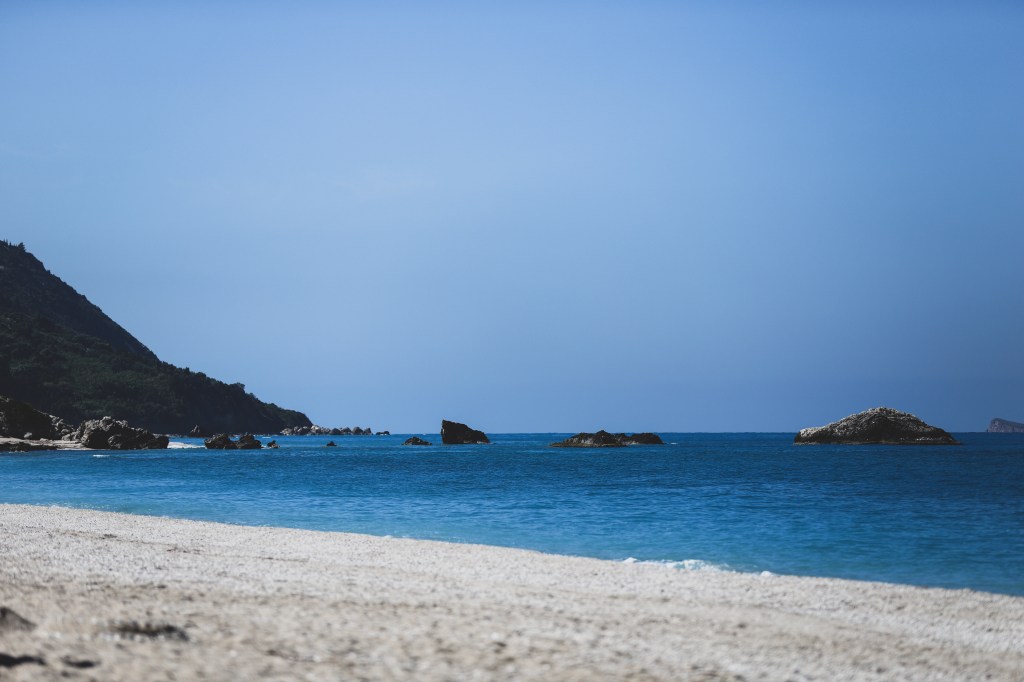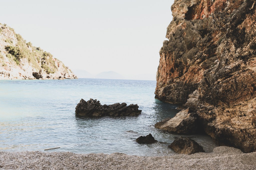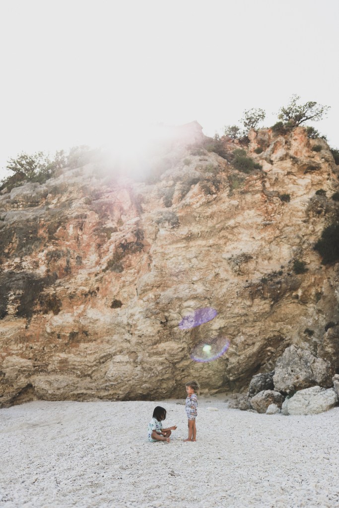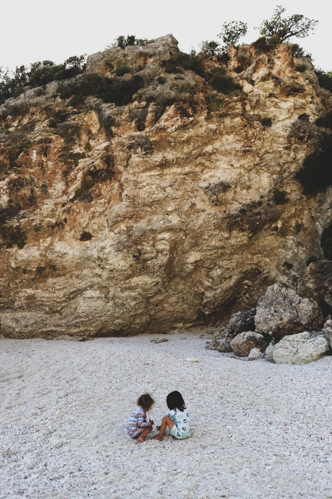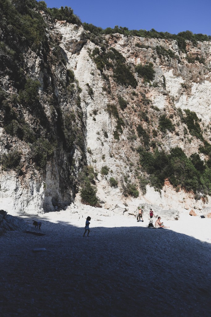 Dupa amiaza am mers la o plaja superba, aproape de satul Vassiliki. Plaja Agiofili. Drumul este destul de ingust pana la parcare, incape o singura masina (si e cu dublu sens). Nu vreau sa imi imaginez cum e aici in plin sezon, mi s-a parut dificil de mers chiar si acum, la inceput de mai, cand era aproape pustiu. De la parcare este un pic de coborat pana la plaja (sunt si niste trepte, aproximativ 80-90 trepte, nu foarte multe, dar ultimele sunt destul de inalte si un pic greu de coborat cu un copil mic in brate) iar apoi se deschide plaja. Superba, aproape complet libera, inconjurata de stanci, intr-un mic golf linistit. Vazuta in realitate parea ca e o plaja complet diferita de ce apare pe Google Maps (o plaja ticsita de umbrele colorate, sezlonguri de inchiriat, prosoape si oameni). Acum… nu era nimic. Niciun sezlong, nicio umbrela, nicio barca, cativa oameni rasfirati pe plaja. Chiar am avut impresia ca am descoperit o plaja pustie, delooooc cunoscuta de turisti. Da, asta e farmecul extra sezonului (sau de fapt inceputului foarte timpuriu de sezon deja, pentru ca in mai cam incepe deja perioada de vara si vacanta). Locurile superbe sunt goale si le poti simti magia, fara sa fie umbrite de agitatie si prea multa forfota. Sau in fine, asa le percepem noi, mai frumoase cand nu au fiecare centimetru ocupat. Dintre toate plajele vazute in Lefkada, aceasta si plaja Megali Petra sunt preferatele mele din toata insula!