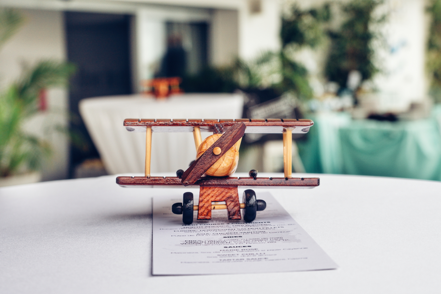 RO: Pe jos au pus globuri pământești (luate de la Jumbo :D), post it-uturi cu țările unde am călătorit, iar ca surpriză ne-au făcut un ceas superb construit dintr-o hartă veche și frunze verzi, care indica ora la care s-a născut Alexei 🙂 A, și să nu uităm, la intrare au pus un panou pe care scria Alexei Airlines și hashtagul evenimentului, #alexeibaptismparty 🙂 Și tot fetele de la Fleur-a-Porter ne-au făcut rost și de niște adorabile avionase de lemn, pe care le-am pus pe fiecare masă-se pare ca au fost achiziționate de la un magazinas mic din Rosetti, unde se vând produse de lemn.
